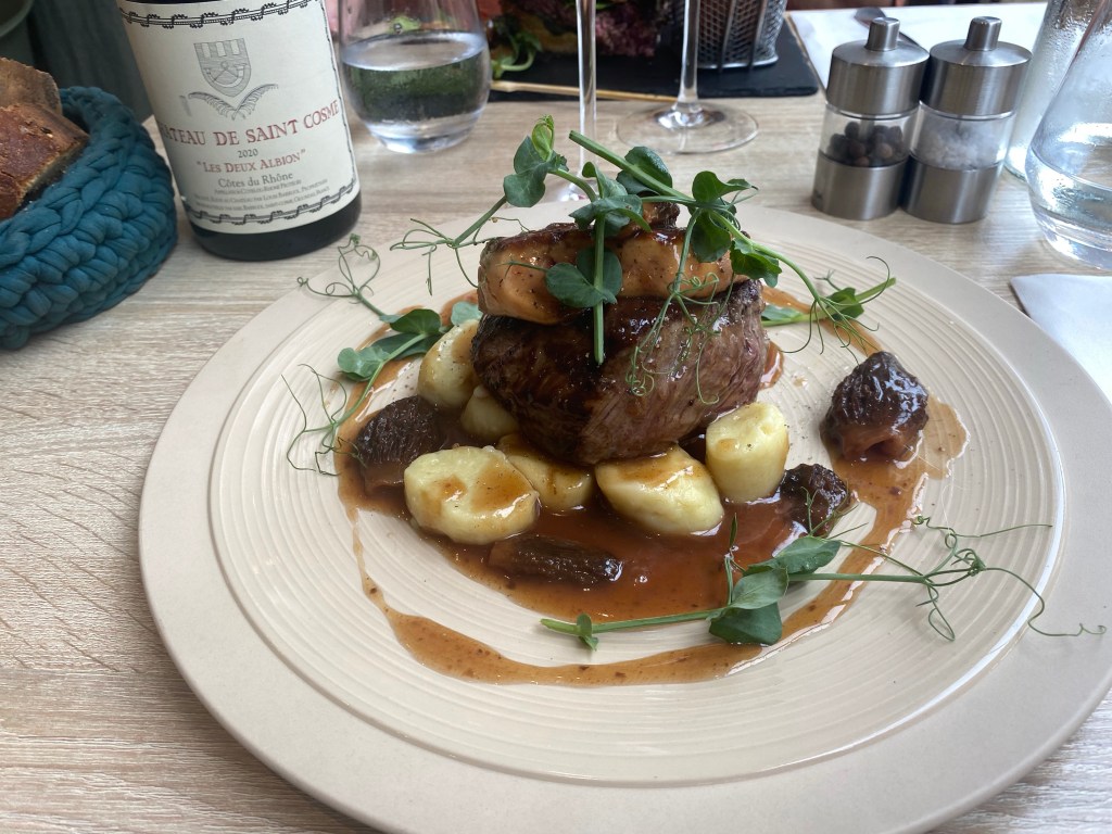 As usual, the food was outstanding. Judy opted for the house burger, rare, with fries. I splurged on the Ann Fertuck special, steak with gnocchi, topped with morels and foie gras’. I have sinned big time. Along with a bottle of Chateau de Cosme, a terrific Gigondas from a vineyard dating back to the fifteenth century..
