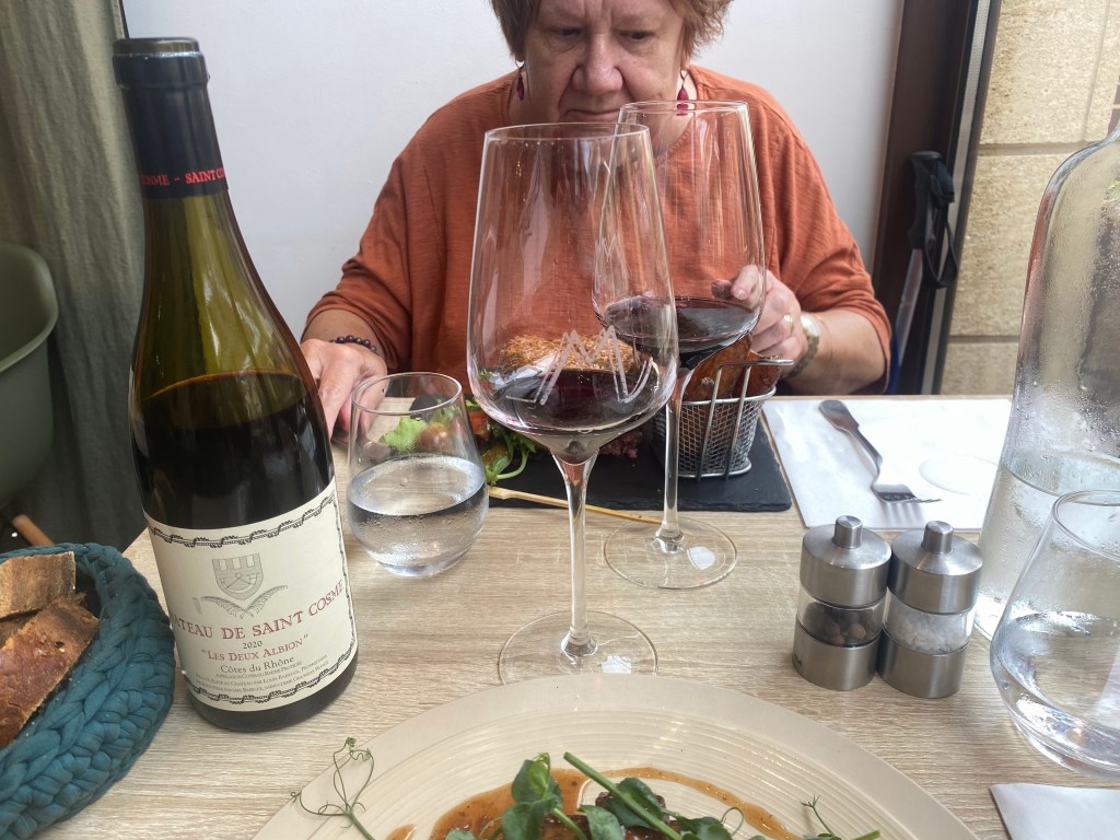 This week has probably been Judy’s best of the last six. Her mobility has improved along with her outlook. We are packing a lot into the last few days. Yesterday, October 25, we lunched with the Groovers at Baragnas in Saint-Siffret. Their food is consistently good. It is owned by a young (parenting) couple, but parenthood, along with a dwindling clientele, has forced the decision to close and sell. Too bad. It is in a converted school and has a great atmosphere. But that’s business. They will rise up, likely in Uzes where there is more traffic (and competition).
