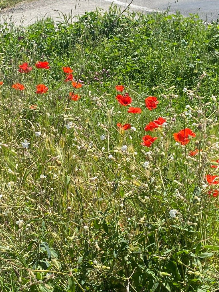 Not puppies. May into June is poppy season in the south. They are everywhere and are as ubiquitous as dandelions in North America. Arguably prettier, and growing in vast fields. Or you may find just the occasional little lonely flower.