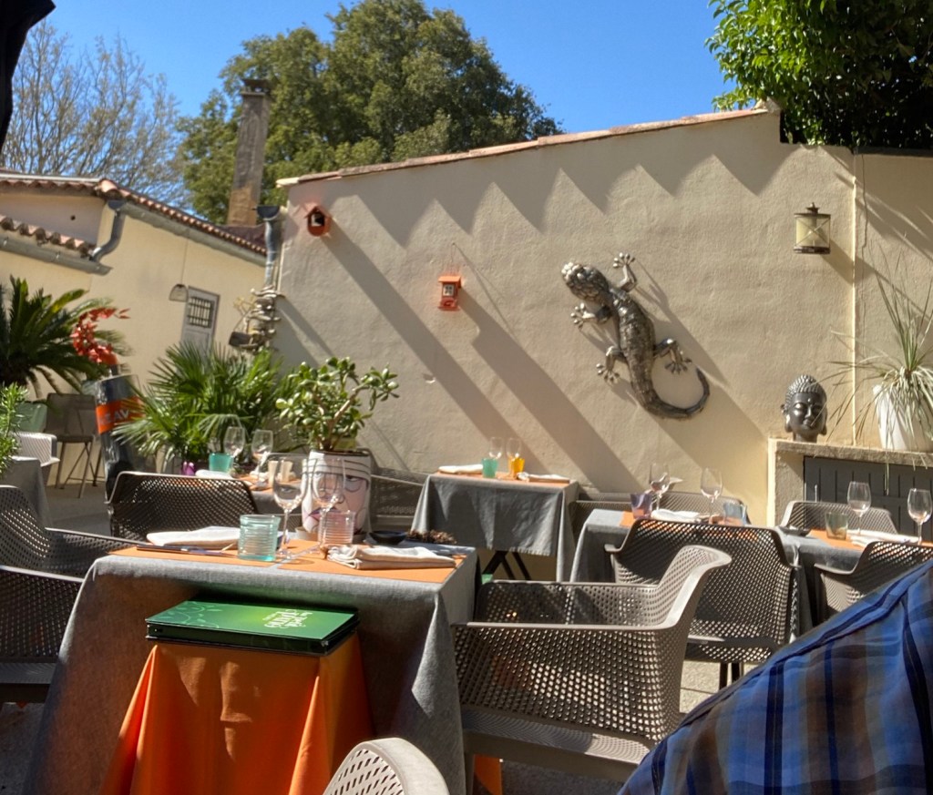 During the last week, we have enjoyed two meals out. Le Grain de Soleil was our target Saturday, the first big Mistral day. Judy’s appetite ain’t what it used to be, and she only had half of her entrecôte and same for her fries.